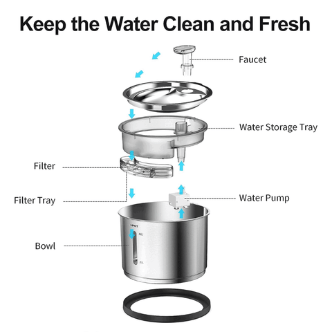 - Acier inoxydable : Choisissez l'acier inoxydable pour votre fontaine à eau pour animaux de compagnie pour une sécurité inégalée. Ce matériau non toxique et résistant à la corrosion garantit une source d'eau hygiénique, privilégiant le bien-être de vos animaux de compagnie et offrant une solution d'hydratation sans souci.